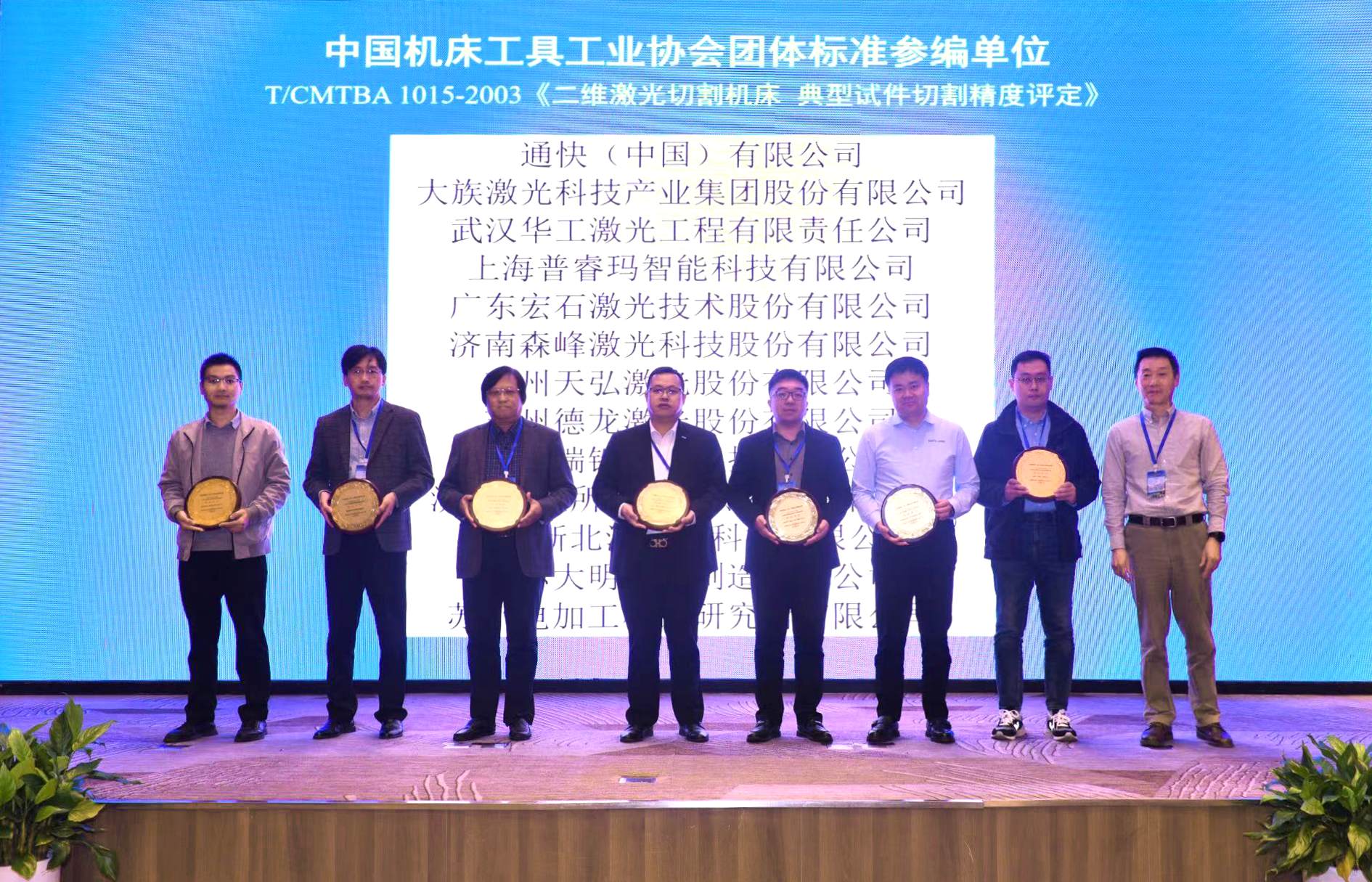 2023年11月15日至11月17日,宏山激光受邀出席中國機床工具工業(yè)協(xié)會特種加工機床分會2023年會員大會。會上,宏山激光獲頒中國機床工具工業(yè)協(xié)會團(tuán)體標(biāo)準(zhǔn)T/CMTBA 1015-2003《二維激光切割機床 典型試件切割精度評定》參編單位牌匾。