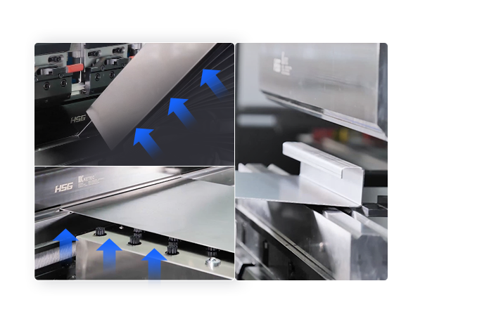 板料在折彎時,托料板的運動軌跡與工件在折彎過程上翻的運動軌跡一致,從而使板料始終受到一個支承力,保證板材不產生變形。